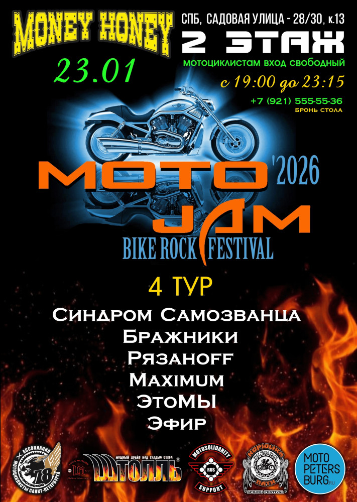 23 января, в пятницу, приглашаем вас на 4-й отборочный тур фестиваля MotoJAM-2026 новый сезон которого ежегодно стартует в октябре, после закрытия мотосезона в Петербурге, в клубе MONEY HONEY на 2 этаже!