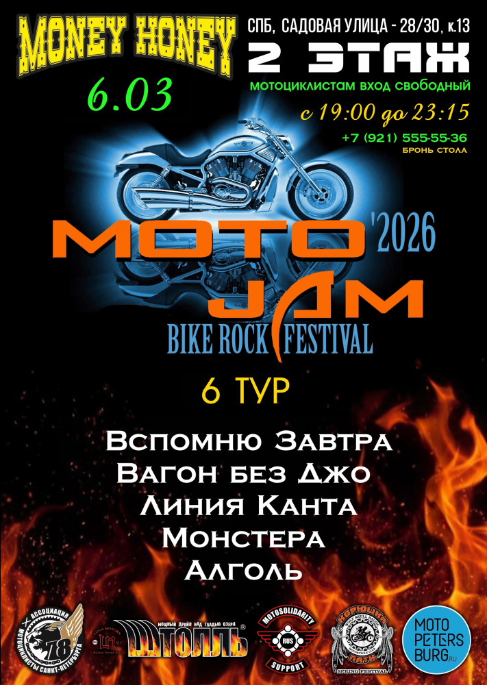 6 марта, в пятницу приглашаем вас на 6-й отборочный тур фестиваля MotoJAM-2026 новый сезон которого ежегодно стартует в октябре, после закрытия мотосезона в Петербурге, в клубе MONEY HONEY на 2 этаже!