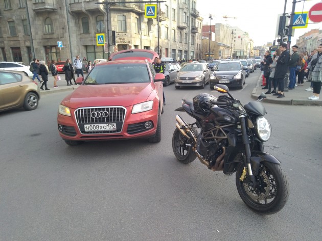 Дтп с мото на повороте с Лиговского пр. на Кузнечный пер.. Девушка слегка зацепила. Все живы и целы.
