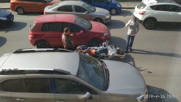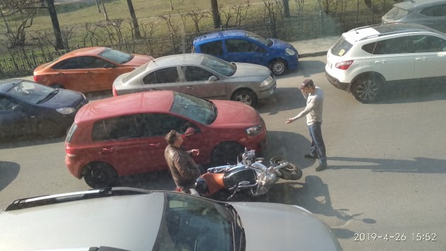 Дтп с мото на Малом пр. Петроградской стороны, д.87. По версии очевидца: мотоциклист подлез под Фольксваген, пытаясь объехать припаркованную вторым рядом машину (припаркованная машина уже уехала на момент съёмки).