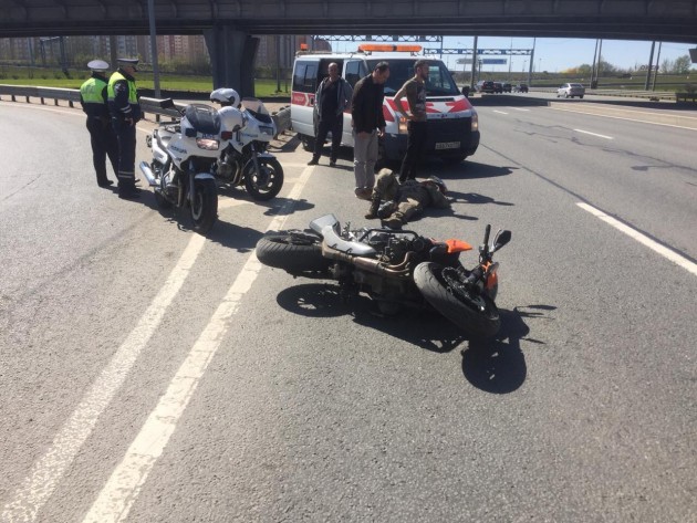 Дтп с мото примерно в 13:30 на повороте с Волхонского ш. на Таллинское ш.(в сторону города). Пьяный мотоциклист пытался свалить, но не справился с управлением.