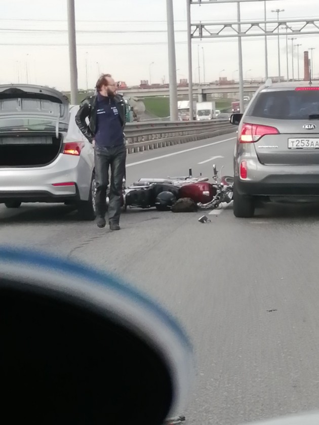 Дтп с мото на внутренней стороне КАД, 56-й километр, перед Вантовым мостом.