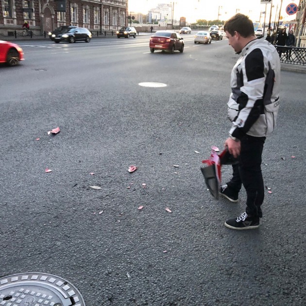 Дтп с мото на перекрестке Литейный пр.и ул. Шпалерная. Мотоцикл Ducati, мотоциклист Никита. Жив, здоров, мотоцикл поврежден, но на ходу. Range Rover при повороте направо из второго ряда, подрезал мотоциклиста, двигавшегося прямо в правом ряду. На месте есть другие мотоциклисты.