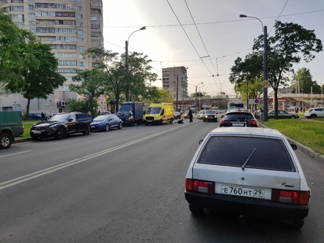 Дтп с мото примерно в 19:00 на перекрестке пр. Славы и ул. Будапештская. Пешеход выбежал из-за припаркованной машины.