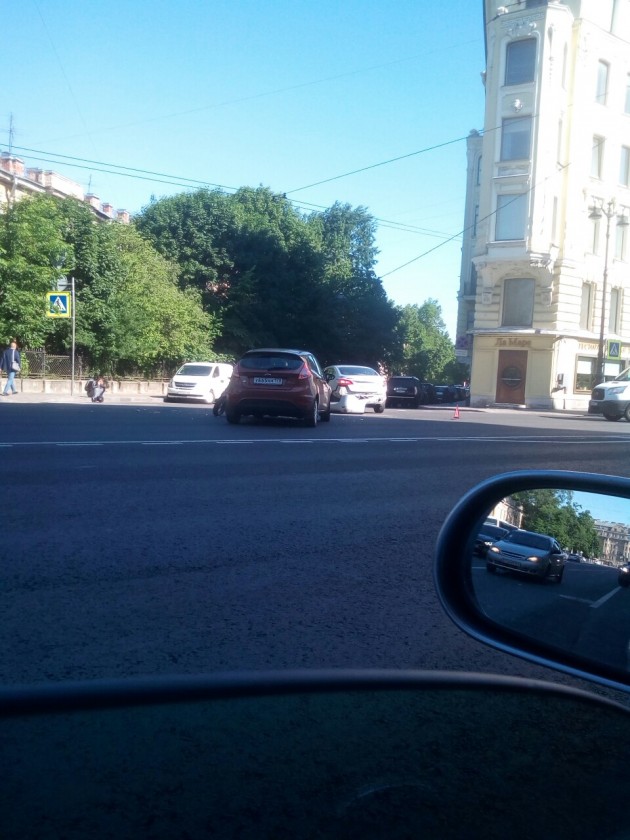 В ДТП попали два автомобиля и мотоцикл. Мотоциклист цел, сидит на поребрике отходит от шока.