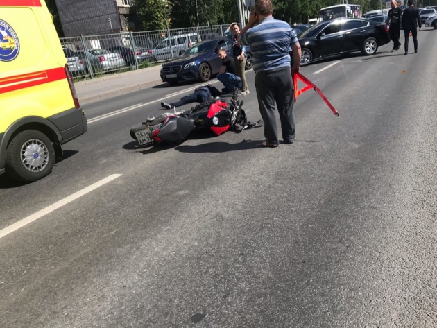 Примерно в 14:21. Мотоцикл и еще участники. Дтп с мото на пр.Маршала Блюхера. Мотоциклист живой.