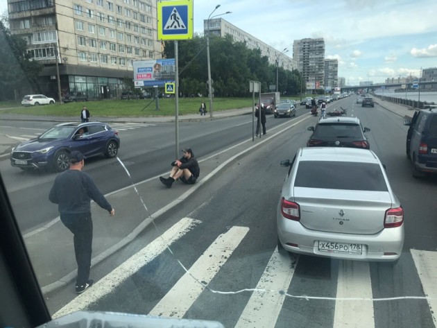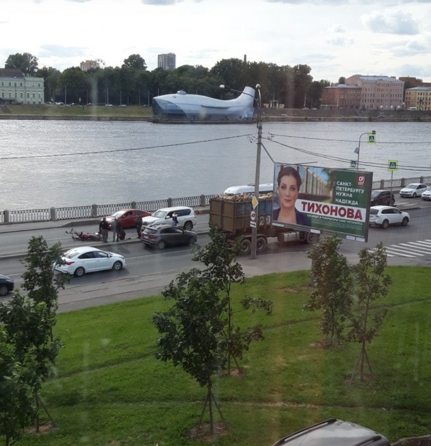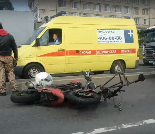Дтп с мото примерно в 18:00 на Октябрьской набережной, д.60. Мотоциклистка сбила велосипедиста на нерегулируемом пешеходном переходе. Все живы.