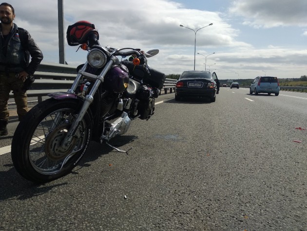 Дтп с мото на развязке у д.Скотное. Мотоцикл догнал авто, которое тормозило перед ДТП. Мотоциклист жив, с переломом уехал в больницу. Пассажир не пострадала.