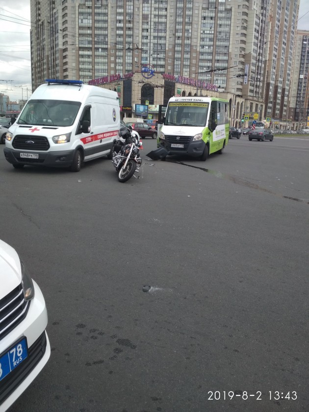Дтп с мото на перекрестке пр. Испытателей и Коломяжского пр.. Маршрутка не пропустила мотоцикл при развороте. Мот Harley-Davidson 9277АК78. Мотоциклист в порядке.