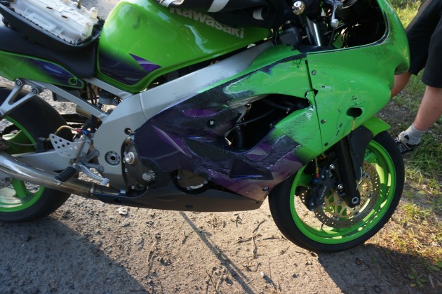 Пацан на двинашке совершал левый поворот, не пропустил мотоцикл. Мотоцикл перетормозил и упал, вынесло на проезжую часть, хорошо там никого не было. Я ехал следом, остановился и помог отогнать мот на обочину, ещё один из нас поехал догонять горе автолюбителя. Когда горе автолюбитель приехал на место ДТП, оказалось, что чижику - 19 лет, права получил менее полугода назад.