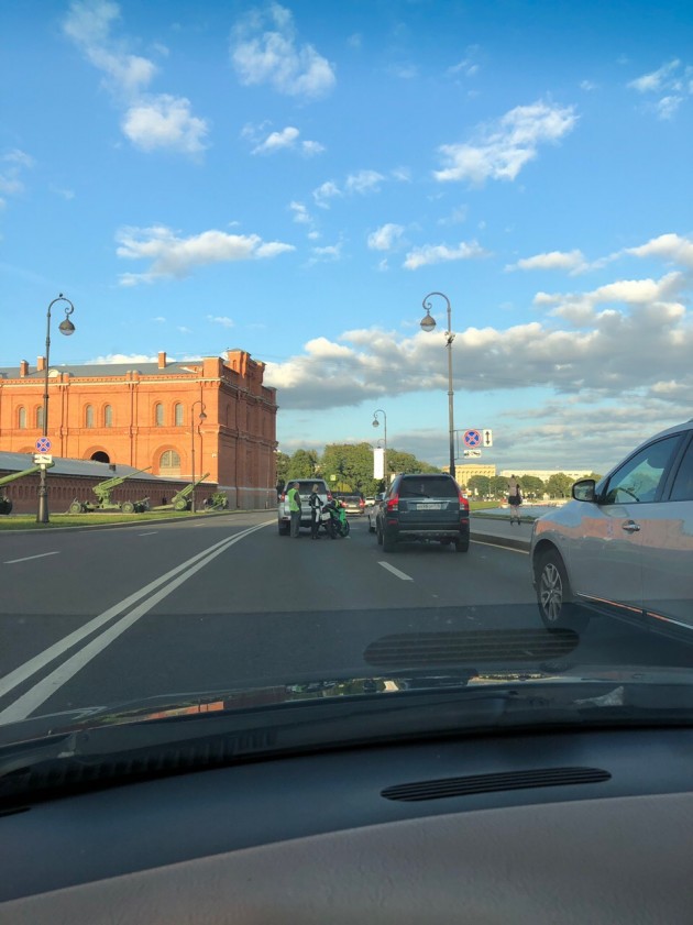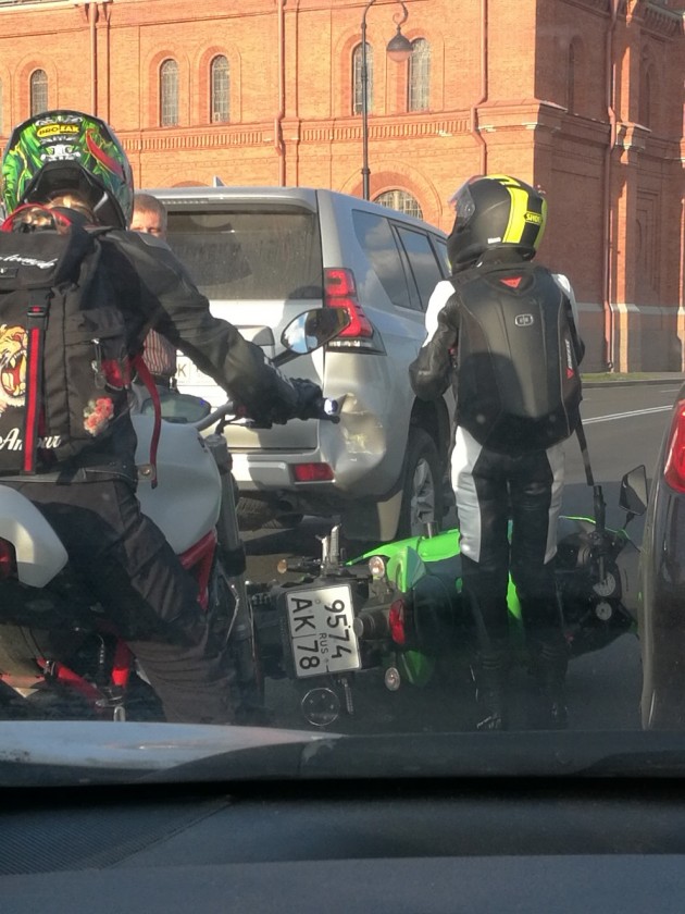 Дтп с мото на Кронверкской наб.. В пробке мотоциклистка догнала прадо и упала на камри.