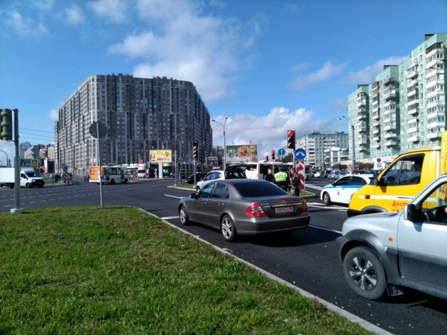 Дтп с мото на перекрестке с пр. Просвещения на ул.Хошимина. Мотоциклист живой, ходит. Службы уже на месте.