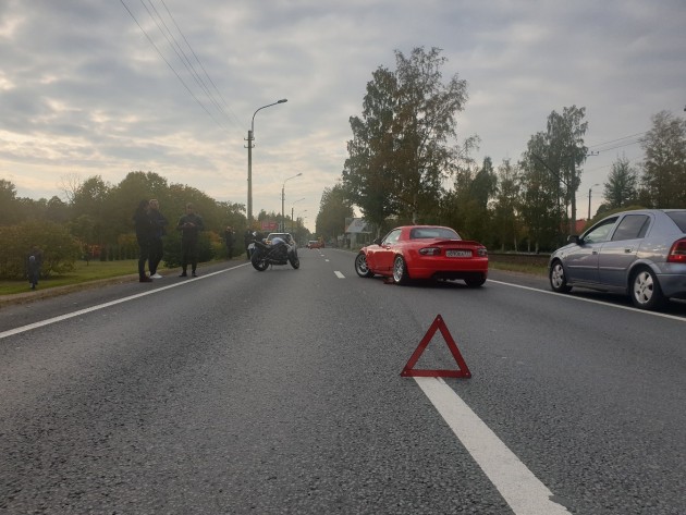 Дтп с мото на Приморское шоссе д.15. Мотоциклист цел (возможно что-то с плечом/клюцичей). Мот ехал в пределах своей полосы, авто не пропустил при перестроении. Вину отрицает.