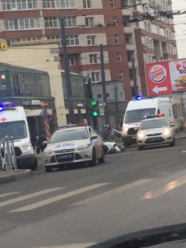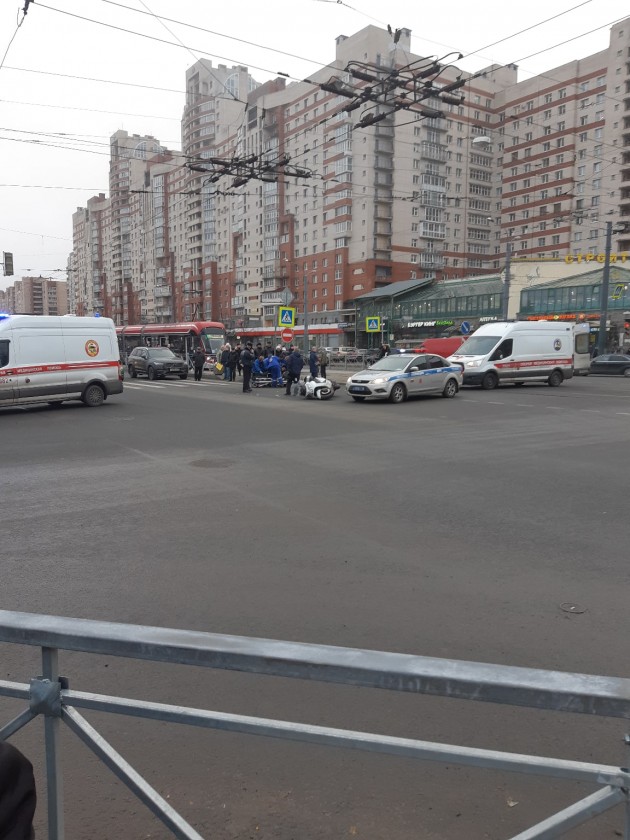 Дтп с мото (максискутер) примерно в 12:30 на перекрестке пр. Просвещения и ул. Есенина. Водитель (м., 1960 г.р.), управляя скутером, в зоне регулируемого пешеходного перехода совершил наезд на женщину 1945 г.р.. В результате ДТП женщина скончалась в карете скорой помощи.