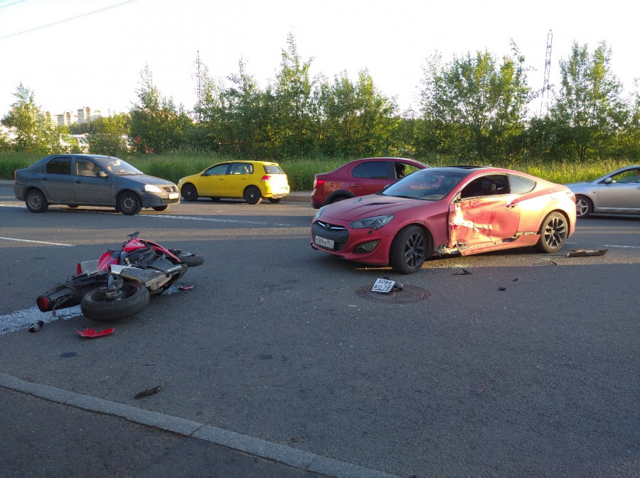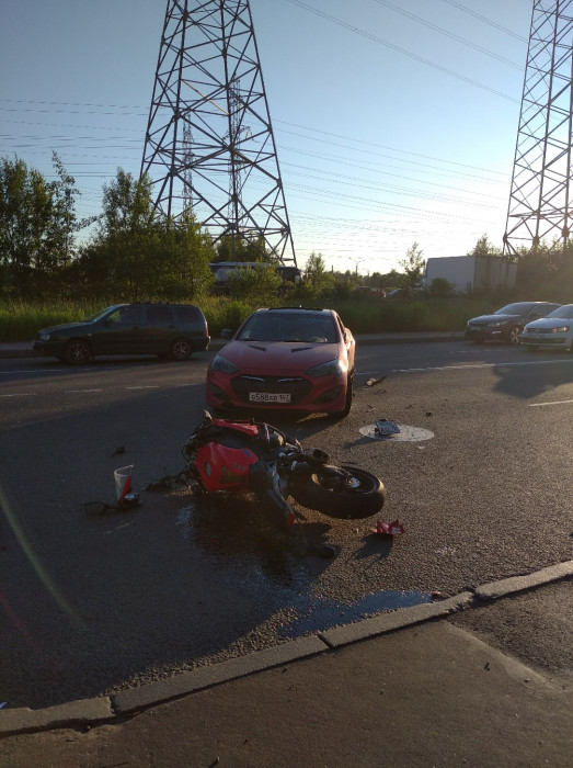 Дтп с мото примерно в 20:20 на ул. Передовиков, д. 13. Hyundai Genesis разворачивался с правого ряда и не пропустил попутный мотоцикл. Мот Honda 5088АО78. Мотоциклист Василевский Денис (перелом ноги), увезен в больницу на Вавиловых.