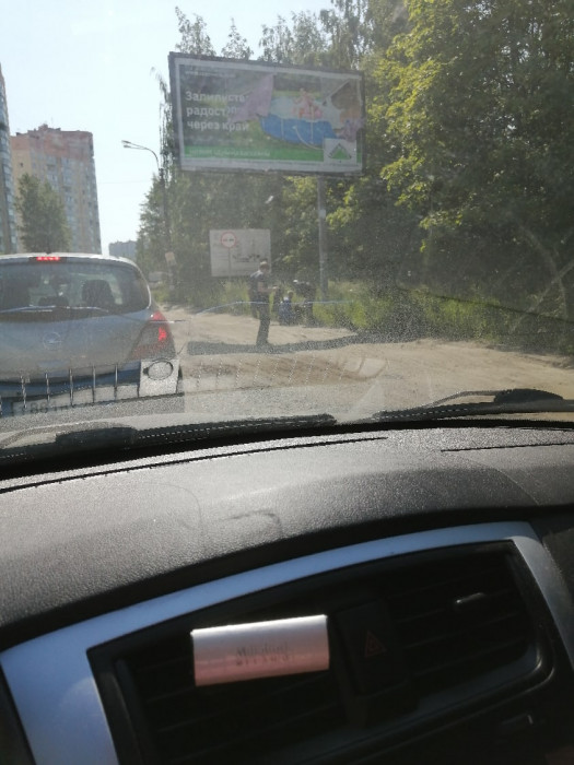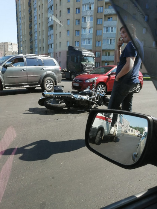 Дтп с мото на Главной ул., д.2к4 (Девяткино). Мотоциклист объезжал пробку посередине по Главной улице и вылетел во встречную машину, около заправки Фаэтон. Все живы.
