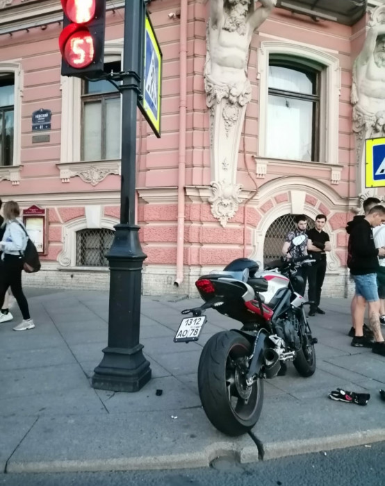 Дтп с мото на перекрестке Невского пр. (д.41) и наб.реки Фонтанки. Мотоциклист ехал по Невскому пр. и на перекрёстке с наб. реки Фонтанки его "подвинули" в автобусную полосу. Сам цел, мот нет, ждут гаи.