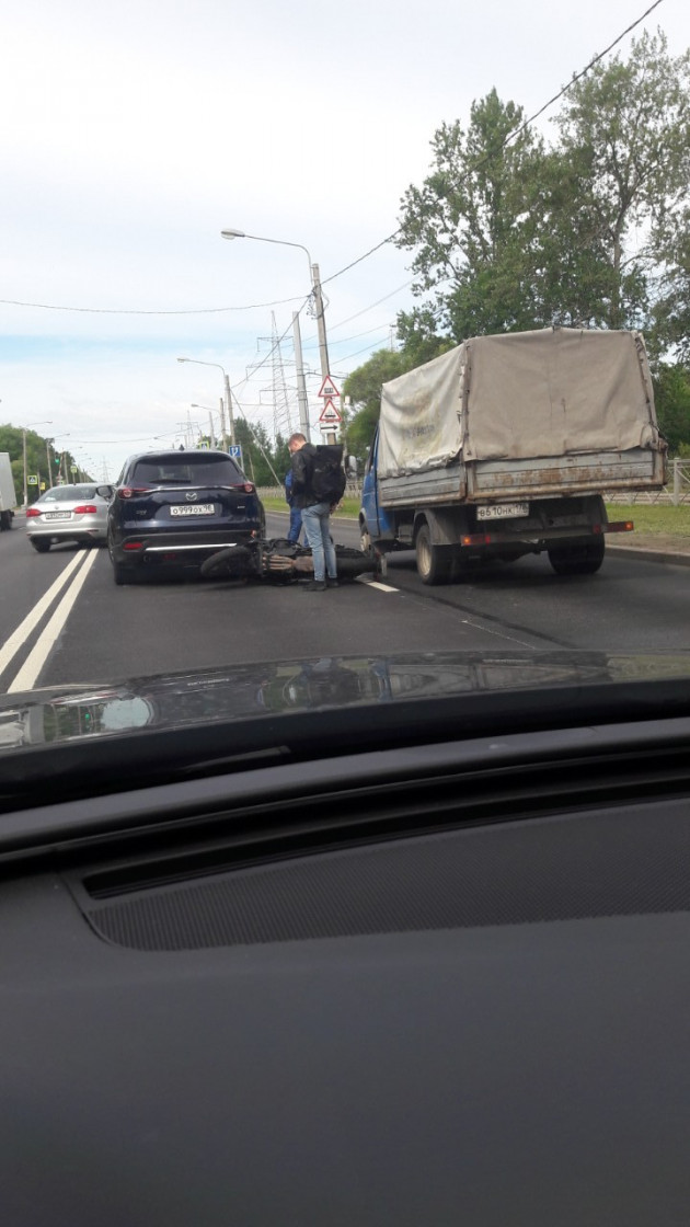 Дтп с мото на Петергофском ш., у поворота на ЛЭМЗ, на полосе из города. Мотоциклист в порядке.