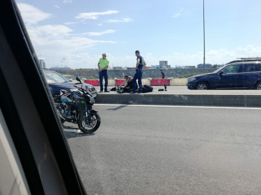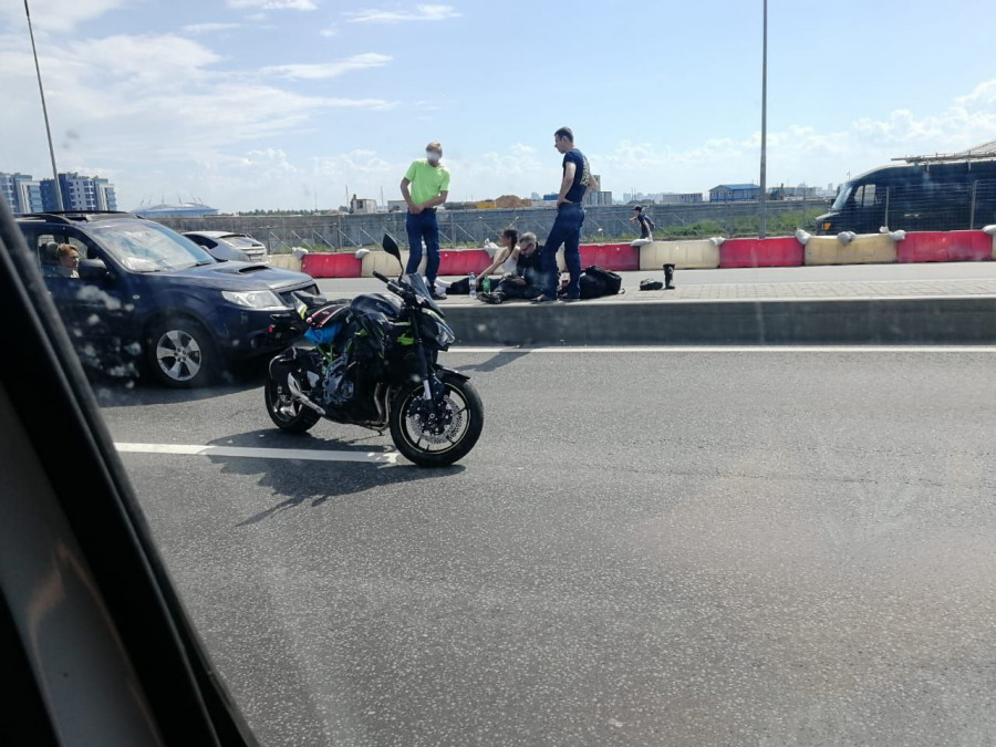 Дтп с мото на Приморском ш., напротив Лахта-Центра. Сбили девочку на мото. Мотоциклистка жива. Рядом стоят пара мотоциклов. Помощь, вероятно, не требуется.