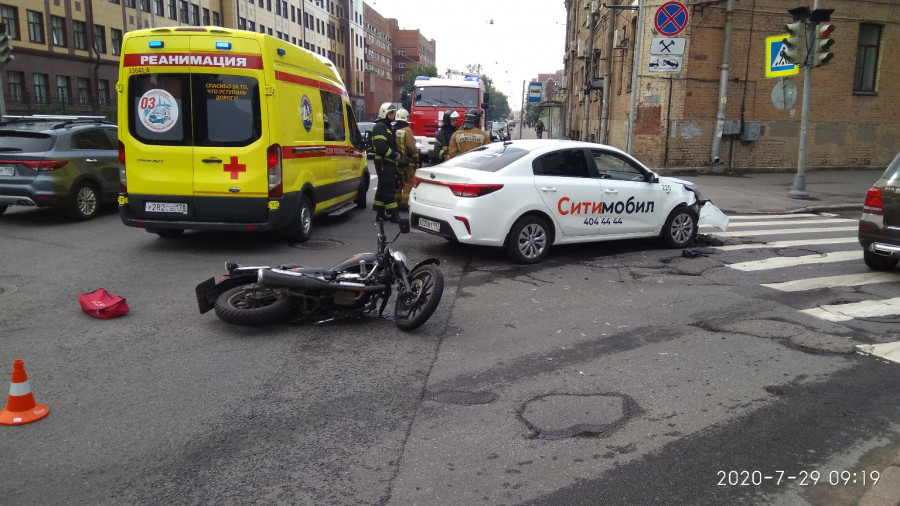 Дтп с мото на перекрестке Большого Сампсониевского пр. и ул. Александра Матросова. Мотоциклист увезен на скорой. Эвакуатор вызвали ДПС.