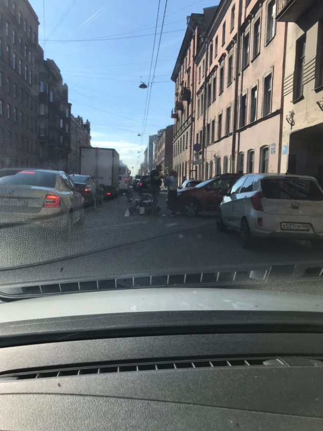 Дтп с мото на 9-й линия ВО, д.68. Дама при выезде со двора не пропустила мотоцикл. Мотоциклист цел, только царапины. Помощь, с его слов, не нужна.