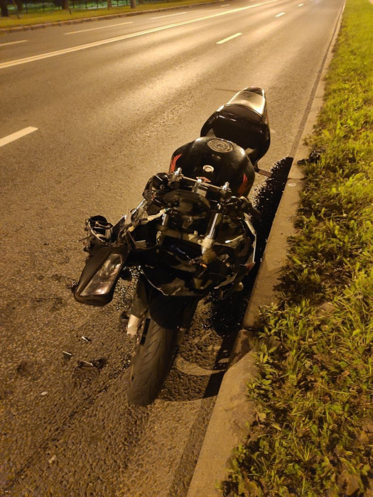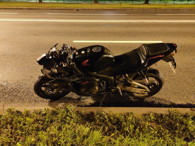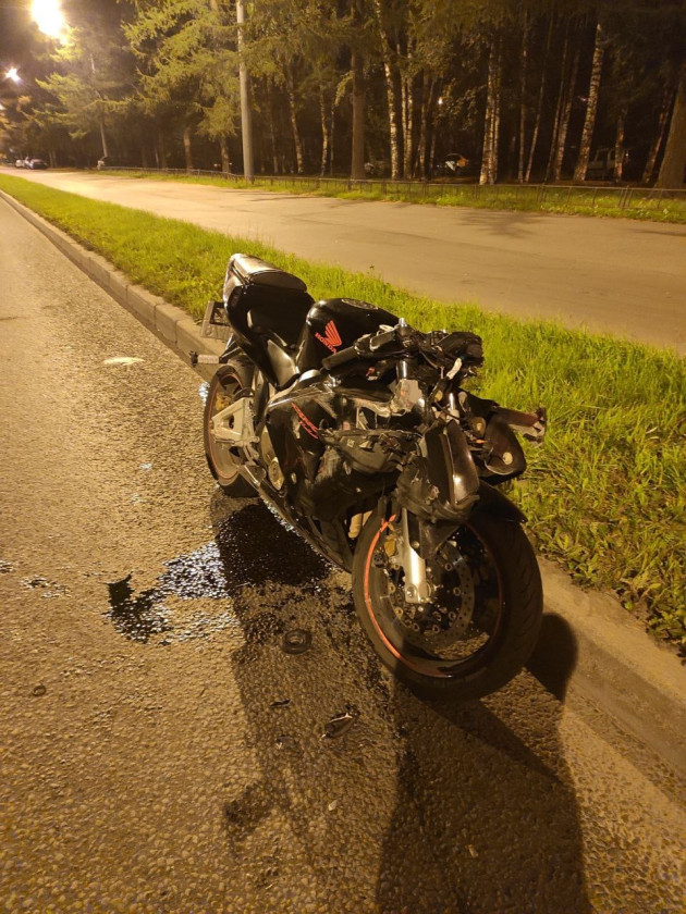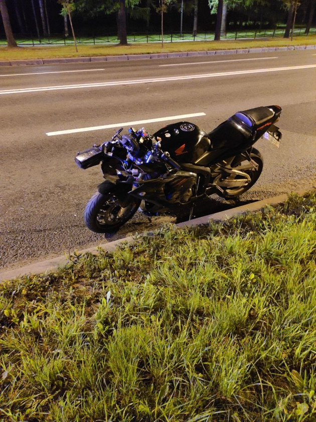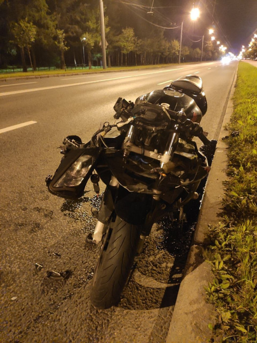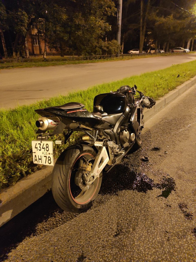 Дтп с мото примерно в 2:00 на Светлановском пр., д. 57. Мотоциклист Ушаков И., 1995 г.р.. Номер мото 4348АН78. Предположительно, на скорости повело заднее колесо на дорожном знаке, что на асфальте, и не справился с управлением. Скорее всего, в состоянии шока говорил, что все хорошо, от госпитализации отказался.