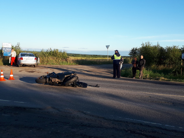 Дтп с мото примерно в 18:00 на Никольском ш., поворот на СНТ "Заречье". Номер мото 8695АВ78. Водитель мотоцикла догнал машину, которая съезжала направо на второстепенную дорогу. Мотоциклист на вид около 30 лет, увезен в больницу, что-то с ногой. ДПС на месте.