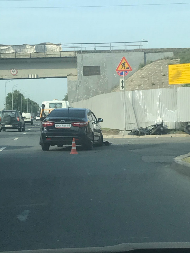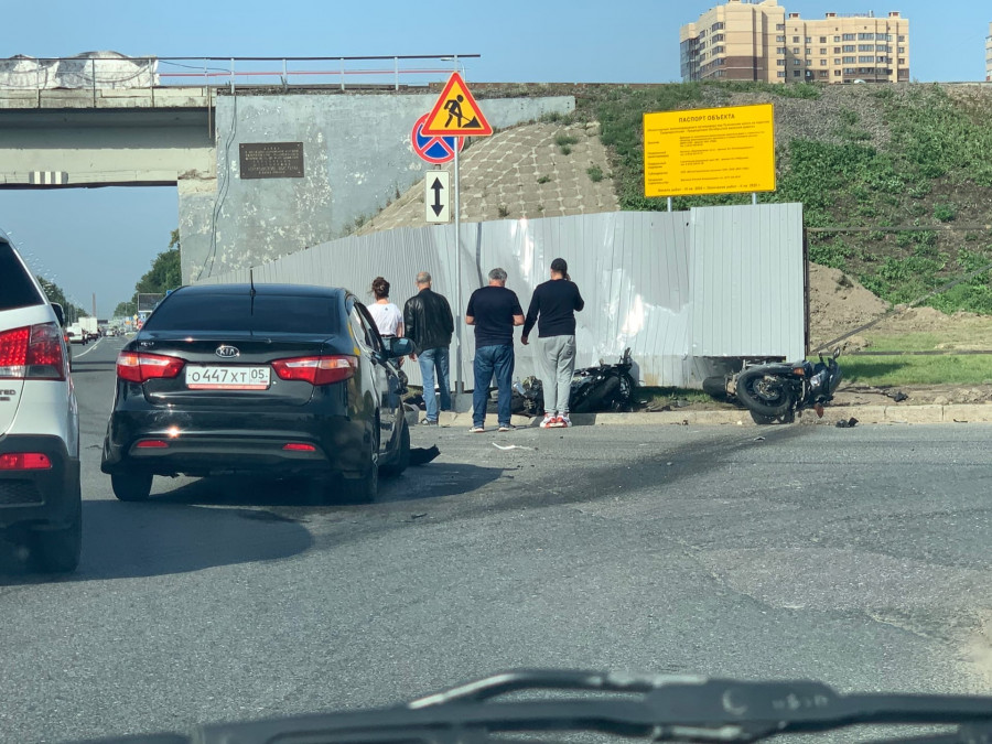 Дтп с мото на Пулковском ш., в направлении к городу, после съезда с КАД у заправки «Газпрома». Киа "отправила" два мотоцикла в забор.