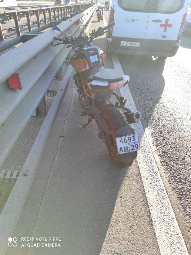 Дтп с мото на КАД, 55-й километр, внутреннее кольцо (59.861119, 30.518956). Мот КТМ оранжевый. На месте скорая.