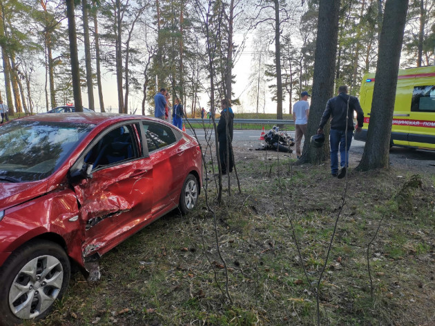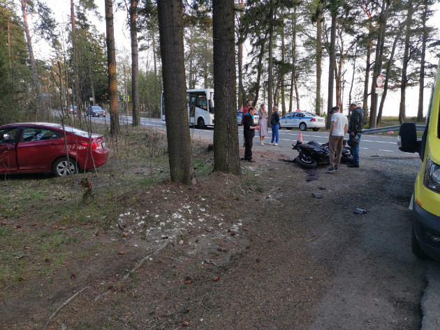 Дтп с мото примерно в 19:50 на перекрестке Приморского ш. и Кавалерийской ул., п.Комарово. Мотоцикл Yamaha R6, номер мота 3557АН78. Скорая на месте, у мотоциклиста что-то с позвоночником.