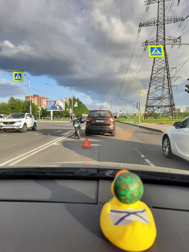 Дтп с мото примерно в 19:30 на перекрестке ул.Передовиков и пр. Энтузиастов. Мотоциклист в порядке.