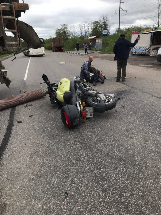 Дтп с мото на Пушкинском ш. (59.727040, 30.171218), в Ломоносовском районе, ближе к Красному селу. Службы на месте. Занято две полосы. Мотоцикл и бетономешалка. Номер мото 9800АО78