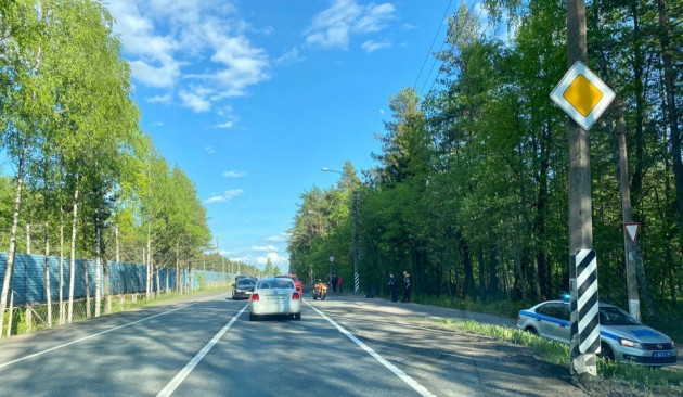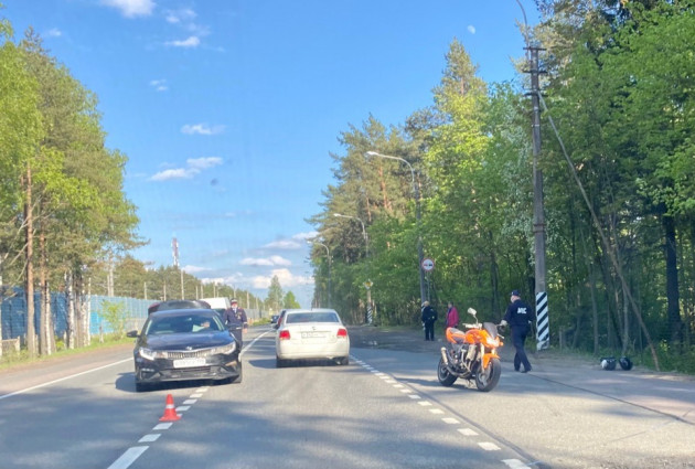 Дтп с мото на перекрестке Зеленогорского ш. и ул.Лейтенантов, п.Комарово. Мотоциклист поздно заметил, что авто собирается поворачивать налево на ул.Лейтенантов и не успев среагировать, задел авто по касательной.