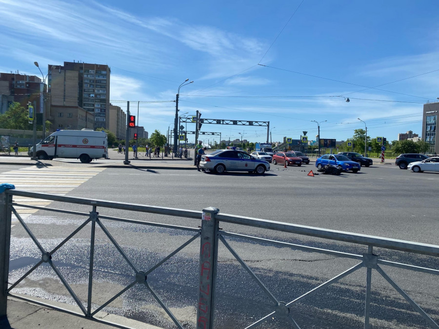 Дтп с мото на перекрестке Дунайского пр. и Бухарестской ул.. Мотоцикл и авто BMW. Белая Yamaha Т-max, номер мота 9809АМ78. Скорая и ДПС на месте. Мотоциклист увезен в Джанелидзе.