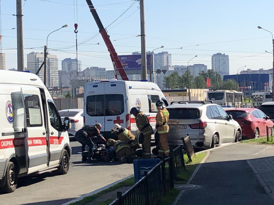 Дтп с мото на ул. Савушкина, д.140. Две скорые, пожарные на месте, состояние пострадавшего неизвестно.