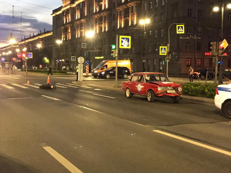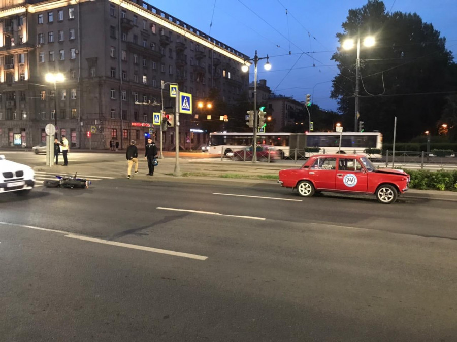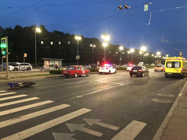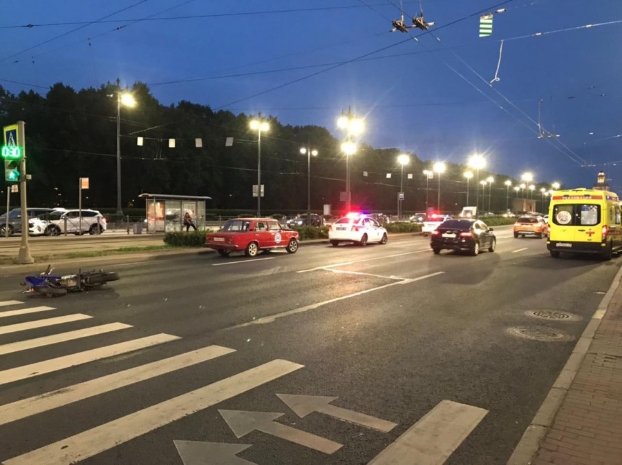 Дтп с мото на Московском пр., д.155. Мот Yamaha XT 250 4552АО78. Мотоциклист (переломы ног) в машине скорой помощи. Родственники оповещены.