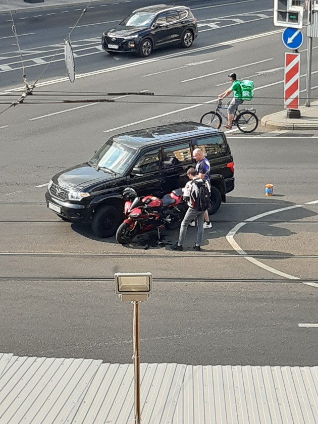 Дтп с мото на перекрестке Московского пр. и Загородного пр.. УАЗ задел мотоцикл. Мотоциклист в порядке.