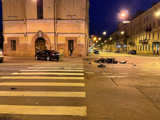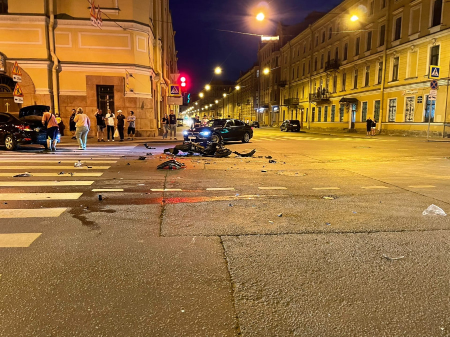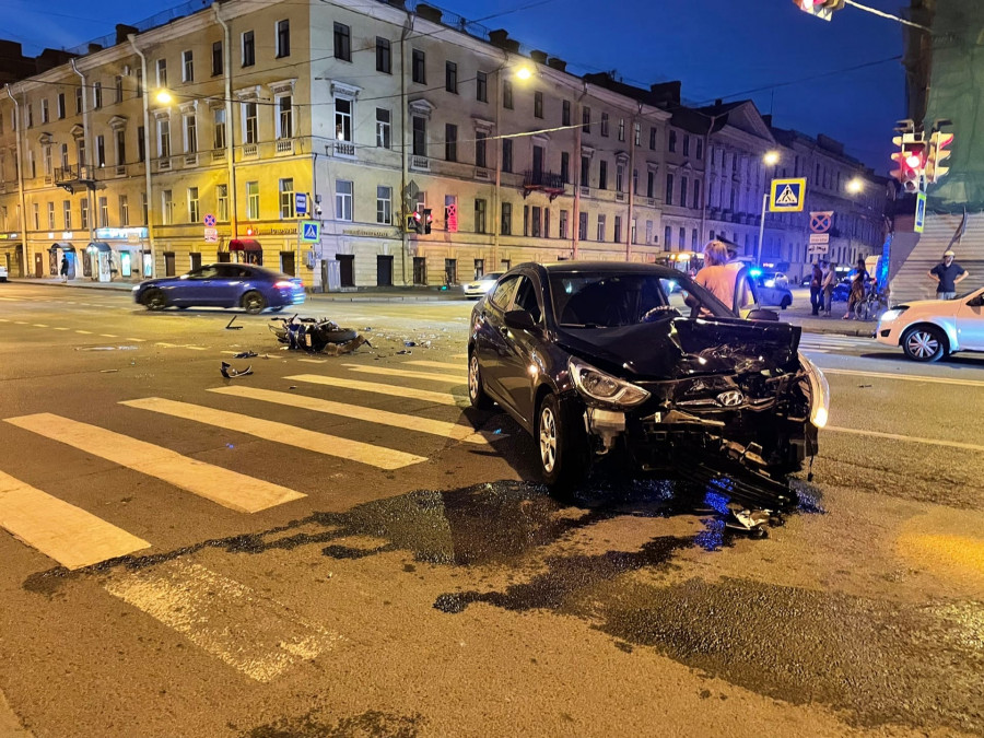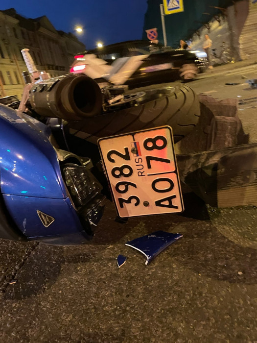 Дтп с мото на перекрестке Лермонтовского пр. и пр. Римского-Корсакова. Мотоцикл Тriumph номер 3982АО78. Мотоциклист Евгений был в сознании, когда грузили в реанимацию. ДПС на месте.