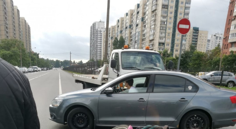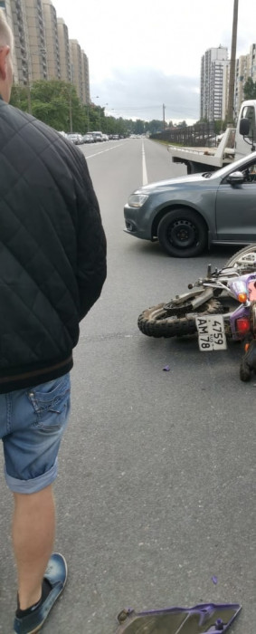 Дтп с мото на ул. Хошимина, д.14 (на развороте). Мотоцикл Kawasaki номер 4759АМ78. Мотоциклист (травма колена, множество царапин) ждет скорую.