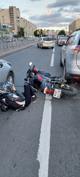 Дтп с мото на перекрестке Ириновского пр. и Индустриального пр.. Мот номер 8237АО78. Водитель мотоцикла (девушка) в порядке. Ждут ДПС.