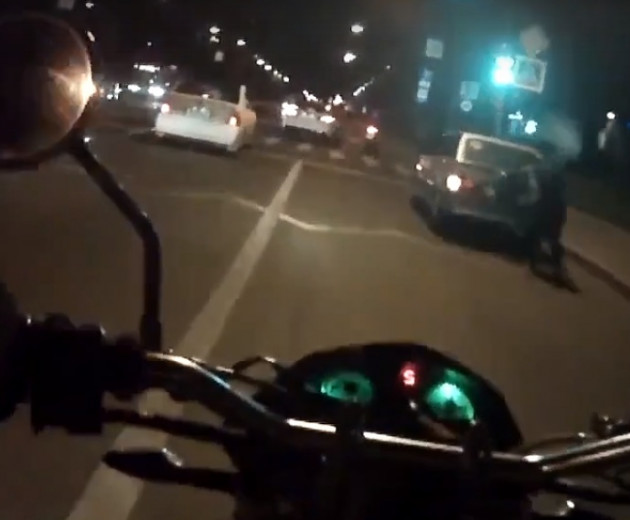 По словам автора видео, как минимум, мотоциклист поцарапал колено. Его байк получил вмятины, был поврежден руль. На легковушке, между тем, не оказалось ни единой царапины – мотоцикл ее не задел.