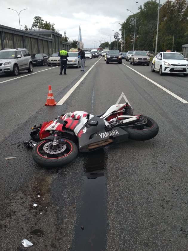 Дтп с мото на Приморском пр., д.36к4. Авто и мот. ДПС на месте. Мот Yamaha R6 номер 1480АР78. Мотоциклист увезен в больницу.
