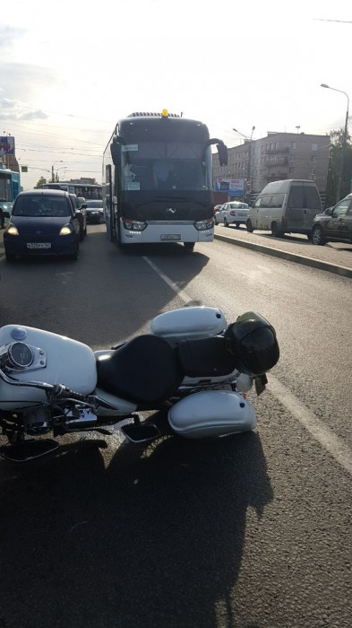 Дтп с мото на перекрестке Народной ул. и пр. Большевиков. Мот и автобус. Мотоциклист в порядке. Помощь не требуется.