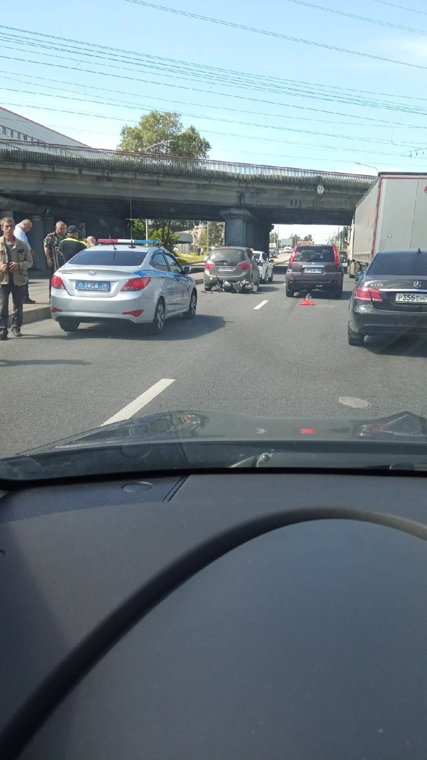 Дтп с мото на Краснопутиловской ул., д. 69. Мот и авто. Мотоциклист на ногах. Оформляются.