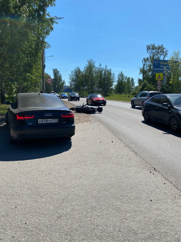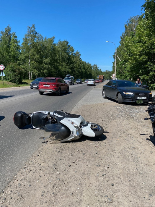 Дтп с мото на ул.Магистральная, Кировск, Лен область. (59.890880, 30.989901) Авто и максискутер Suzuki skywave 400. Мотоциклист в порядке. Помощь не нужна.