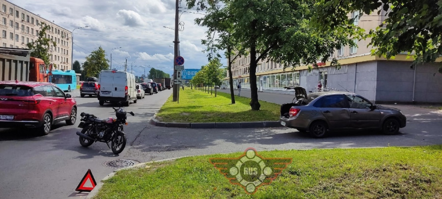 Дтп с мото на Краснопутиловской ул., д. 45. Водитель автомобиля Lada не убедился в безопасности манёвра, поворачивая во двор. Мотоциклист жив, цел, защита отработала, помощь не нужна.
