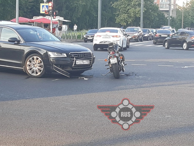 Дтп с мото на перекрестке ул.Подвойского и пр.Большевиков. Авто с мото. О состоянии мотоциклиста информации нет.