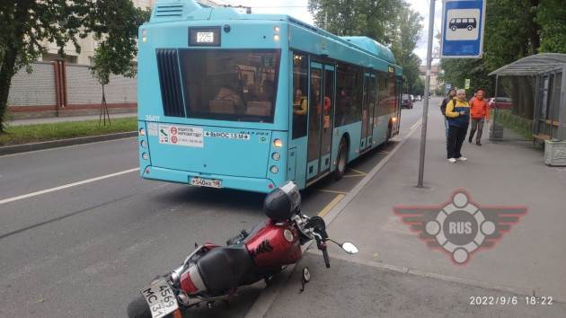 Дтп с мото на ул. Решетникова, д.13. Автобус и мот номер 4569МС31. Мотоциклист в порядке. Ждут ДПС. По предварительной информации, мотоциклист не справился с управлением и упал. После этого, водитель автобуса совершил столкновение со стоящим мотоциклом.