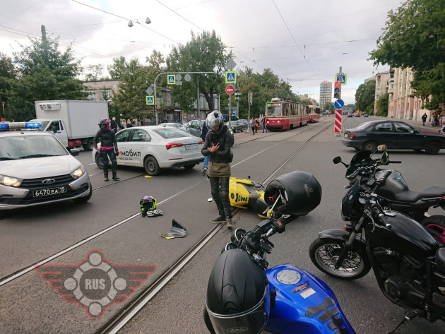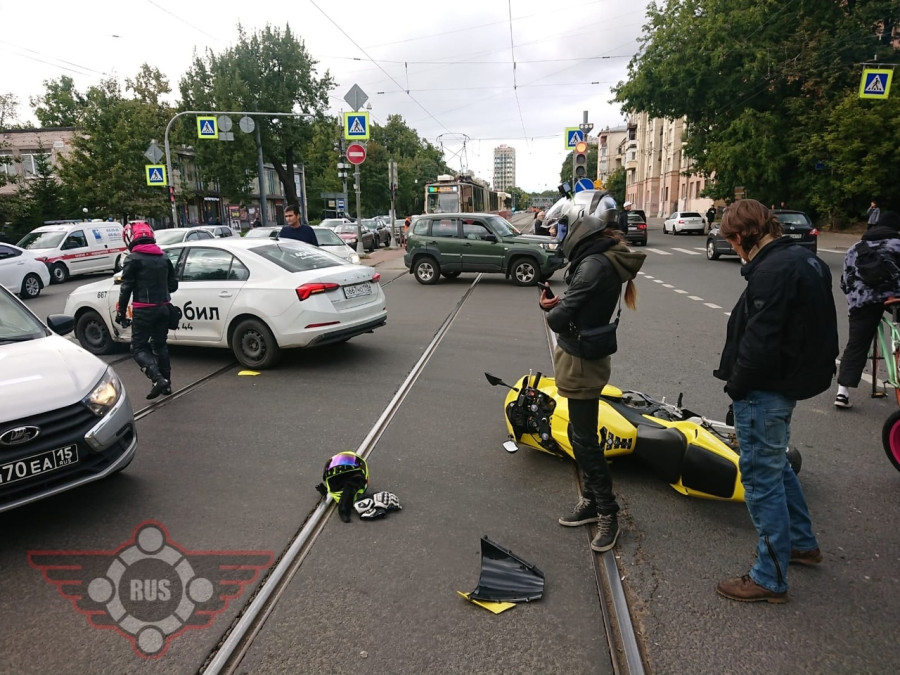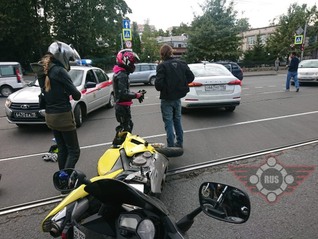 Дтп с мото на перекрестке Лесного пр. и ул. Александра Матросова. Авто и мот. Мотоциклист в порядке. На месте друзья, помощь не требуется. По предварительной информации, водитель такси повернул из крайнего правого ряда налево.