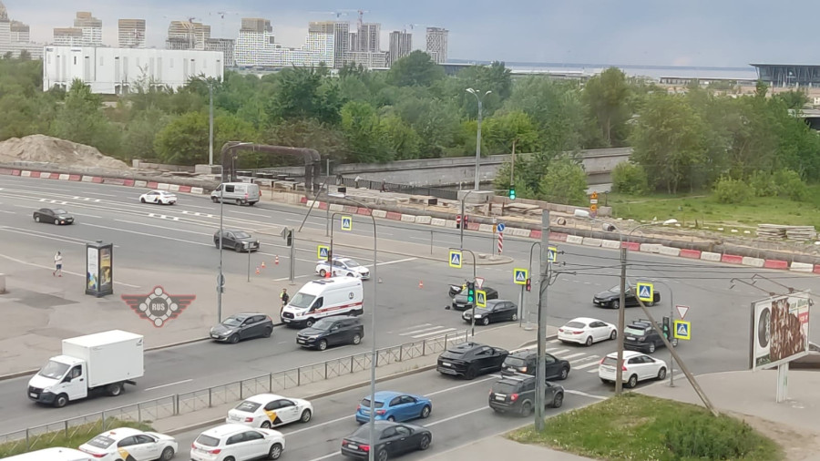 Дтп с мото на перекрестке ул. Кораблестроителей и Новосмоленской наб.. Авто и мот. Мотоциклист (предположительно травма позвоночника) увезен в больницу. У пассажира ушибы.